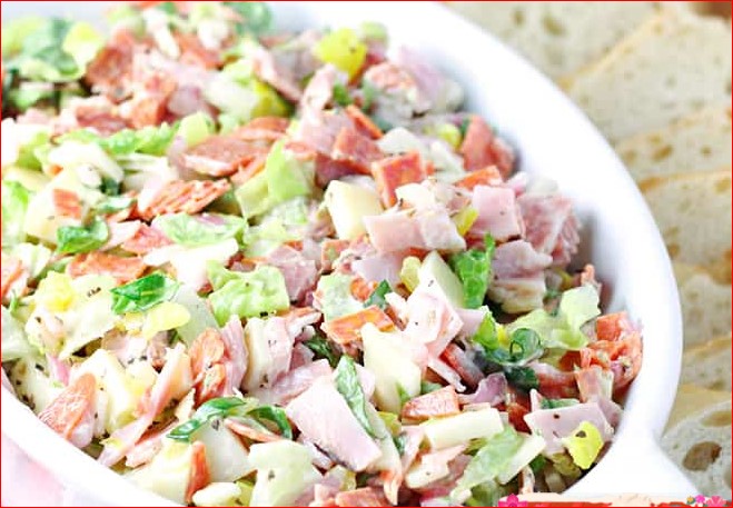 In a large bowl, combine the 1/4 pound pepperoni, 1/4 pound deli Genoa salami, 1/4 pound deli ham, 8 slices Provolone cheese, 1/2 cup diced red onion, and 1/2 cup hot banana peppers. Add 1/2 cup mayonnaise and 1 tablespoon Italian seasoning and stir to combine.